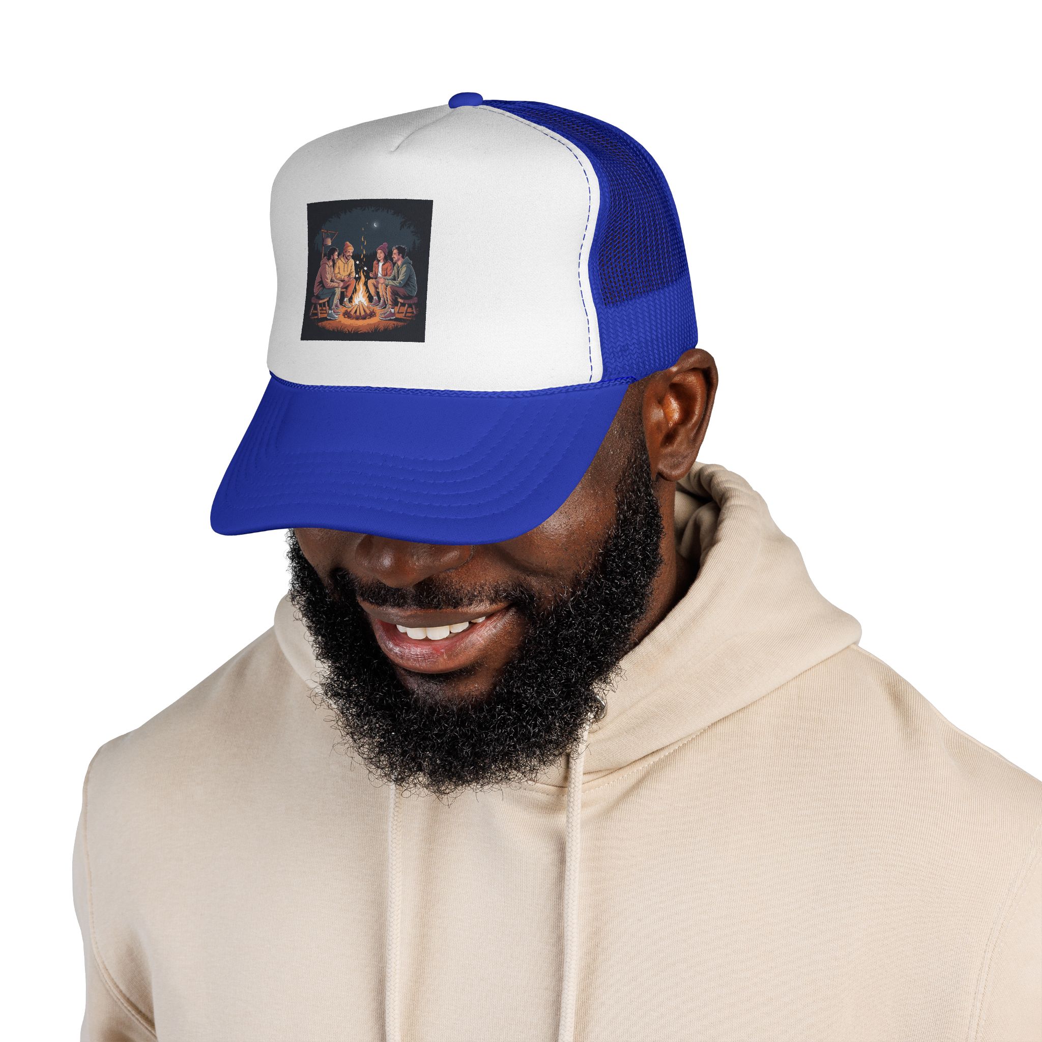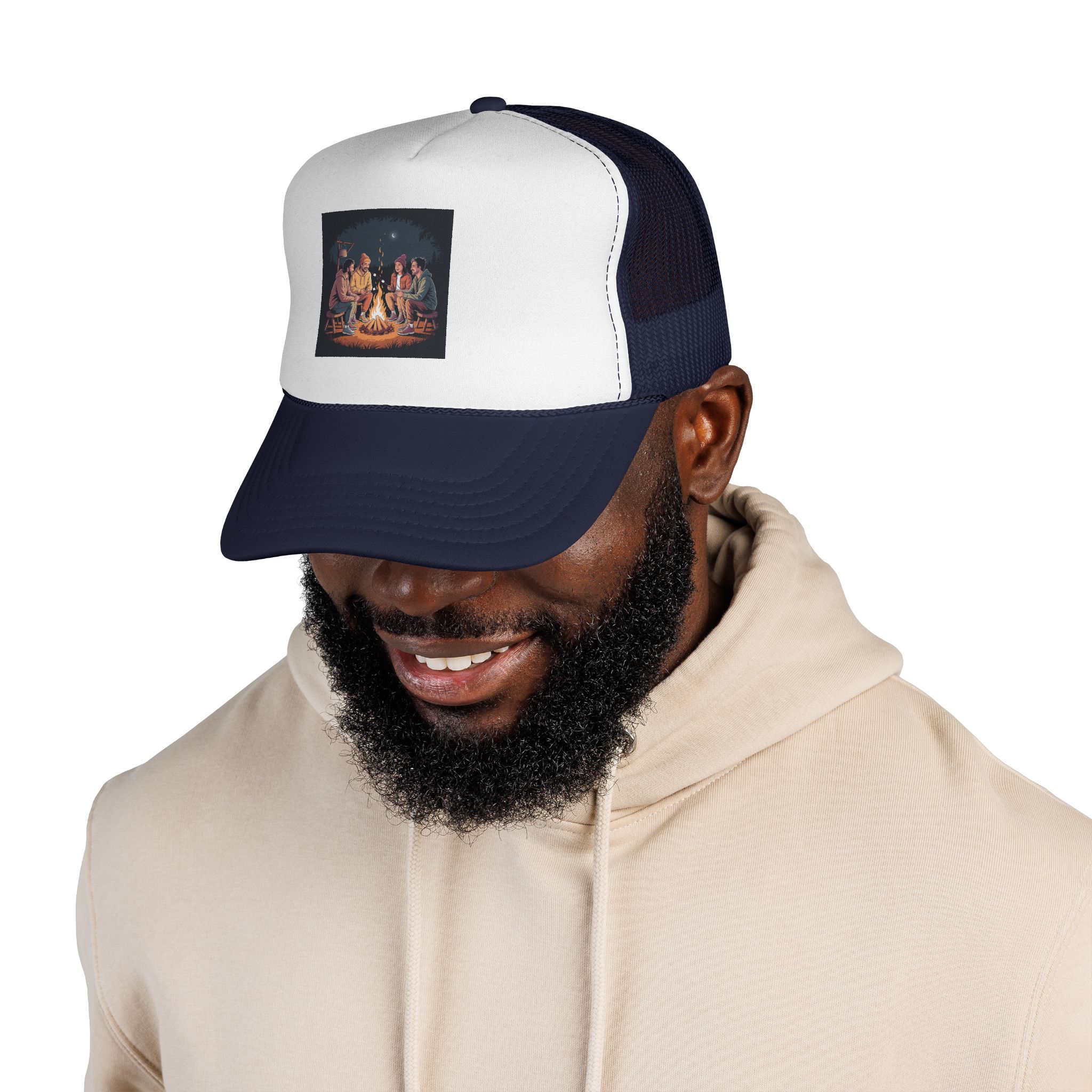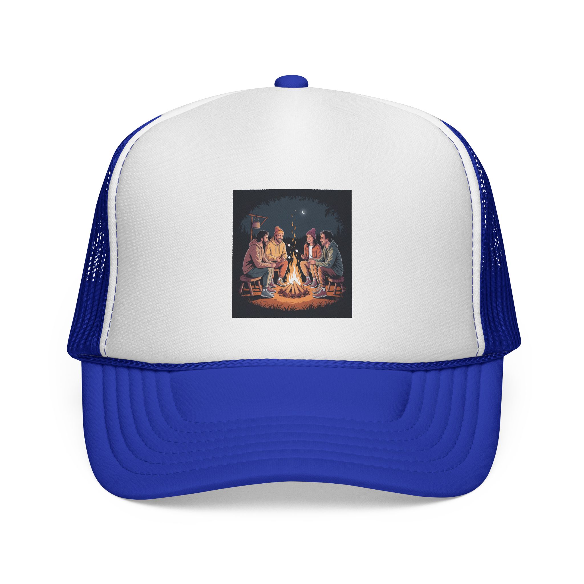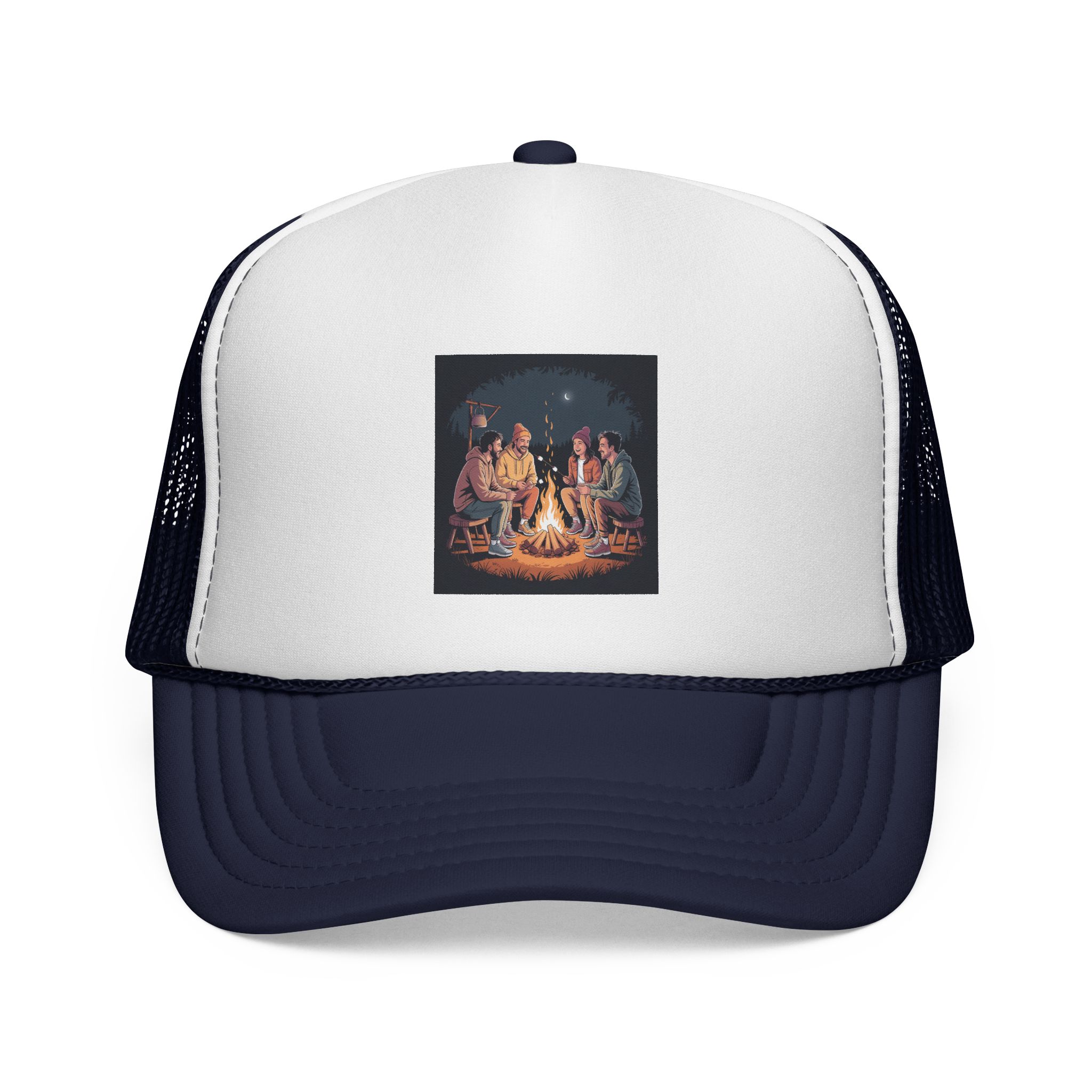 This trucker cap brings campfire nights to your everyday look. The foam front showcases a warm, detailed print of friends gathered around a glowing fire, while the breathable mesh back keeps things cool as stories and laughter stretch into the night. Color-matched trims and a dyed undervisor create a polished, intentional feel — like you brought a bit of the woods with you. It wears comfortably for adults, adjusts easily with a snap closure, and settles into shape after unpacking so it looks lived-in and ready to join your next adventure and match with your friends for your upcoming camping trips!