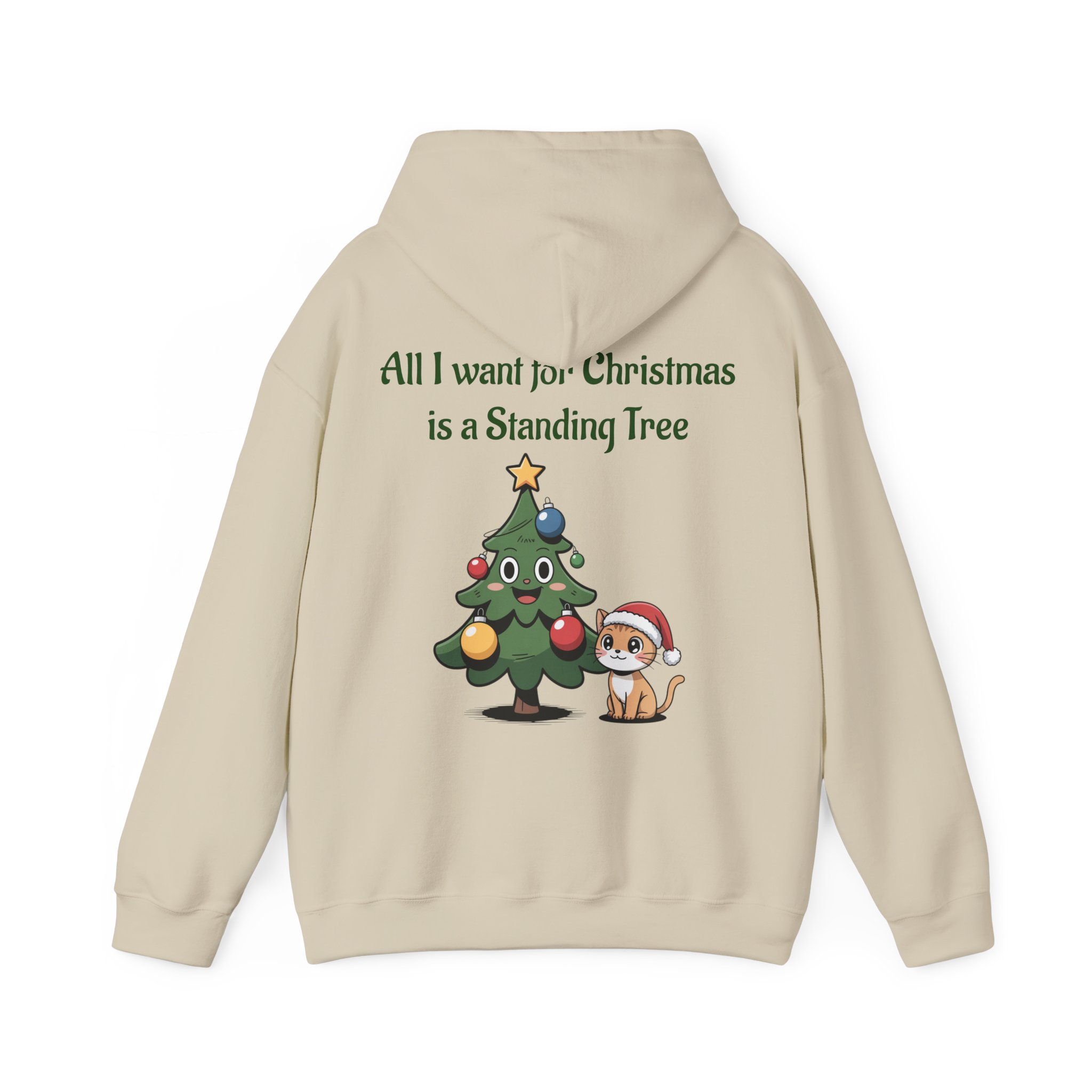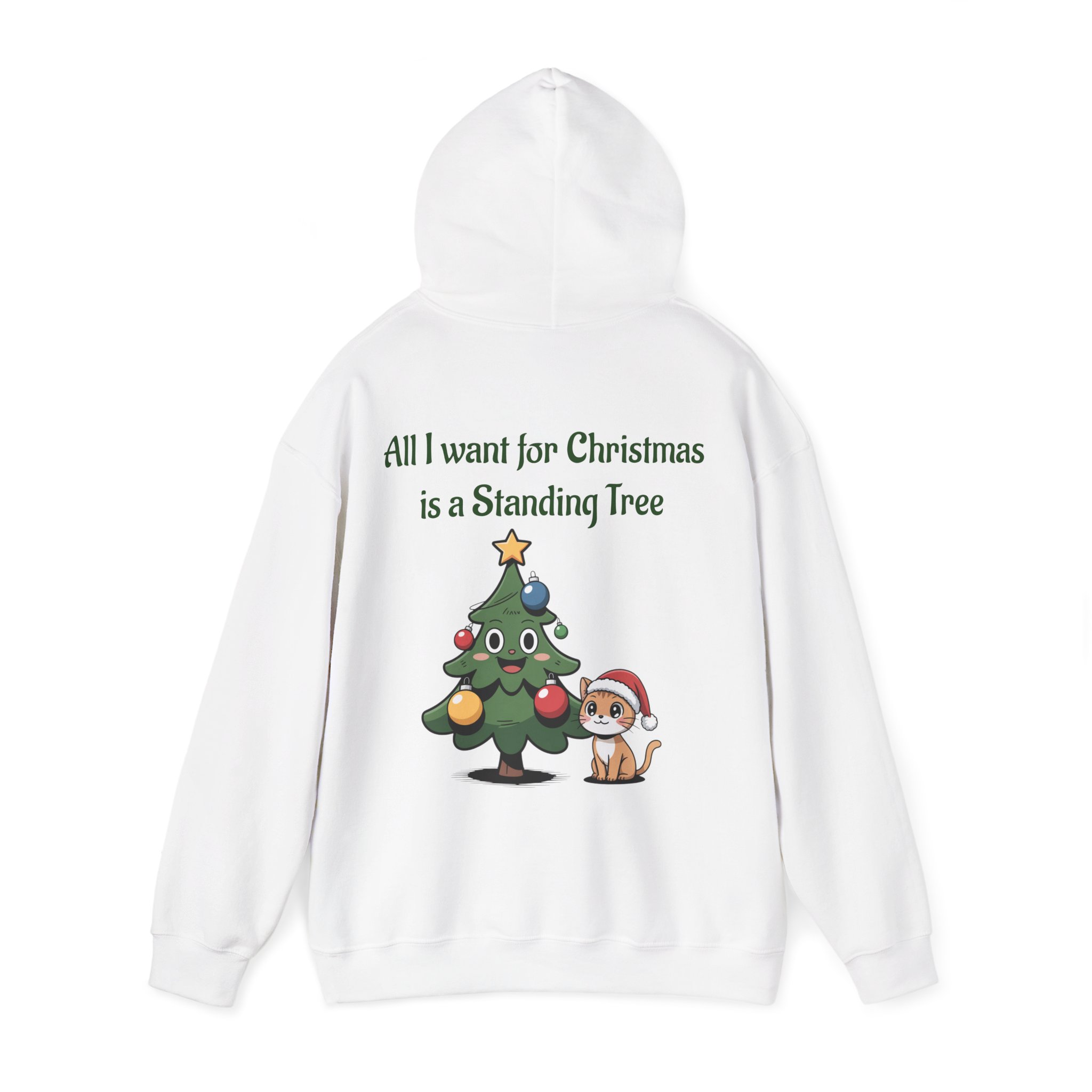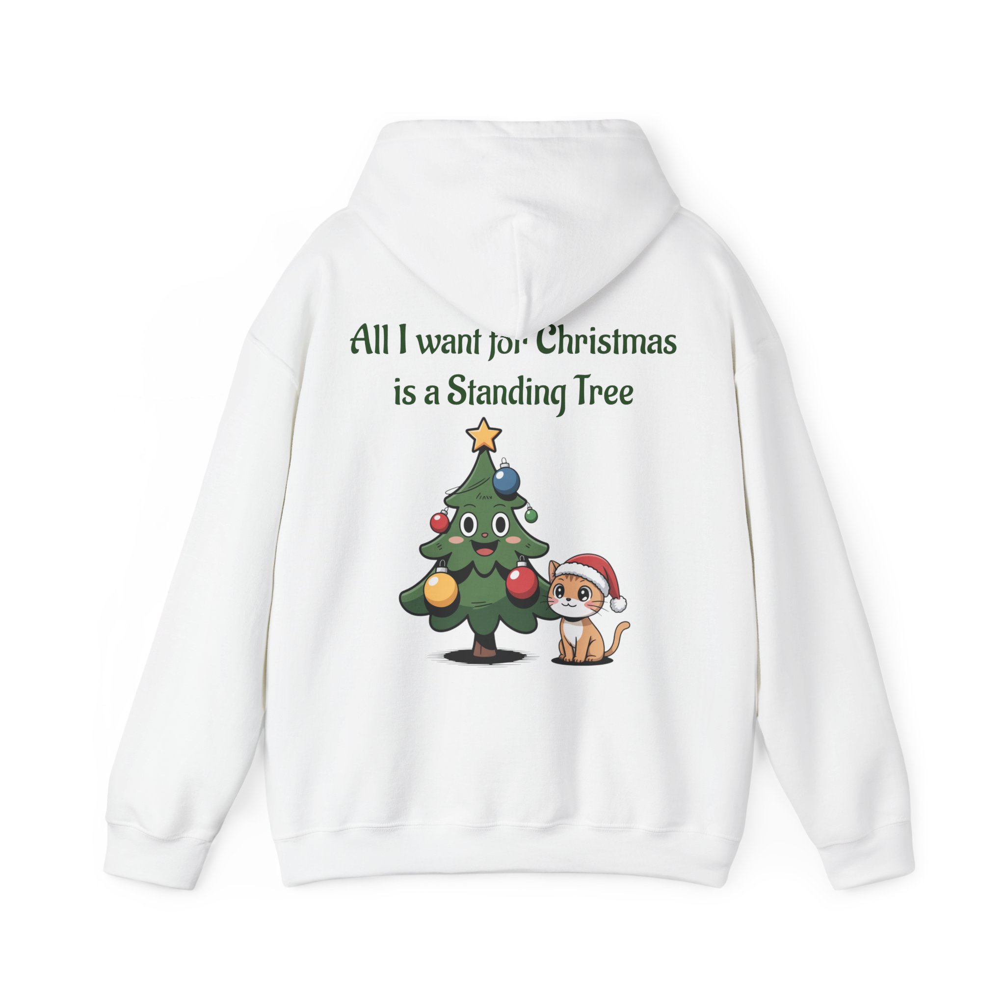 Wrap yourself in cozy, playful cheer with this soft, medium-weight hoodie featuring a sweet holiday cat and tree design. The front allows you to add your cat's picture. The back displays a cheeky decorated tree and the line “All I want for Christmas is a Standing Tree,” bringing a wink of humor to festive gatherings. The roomy kangaroo pocket and double-lined hood keep hands warm and add structure, while the smooth cotton/poly blend holds prints and embroidery crisply. Wear it at tree-lighting nights, casual holiday get-togethers, or quiet evenings by twinkling lights — it settles like a warm hug and sparks smiles whenever you move. And maybe, just maybe, your cat will grant you your wish 😉.