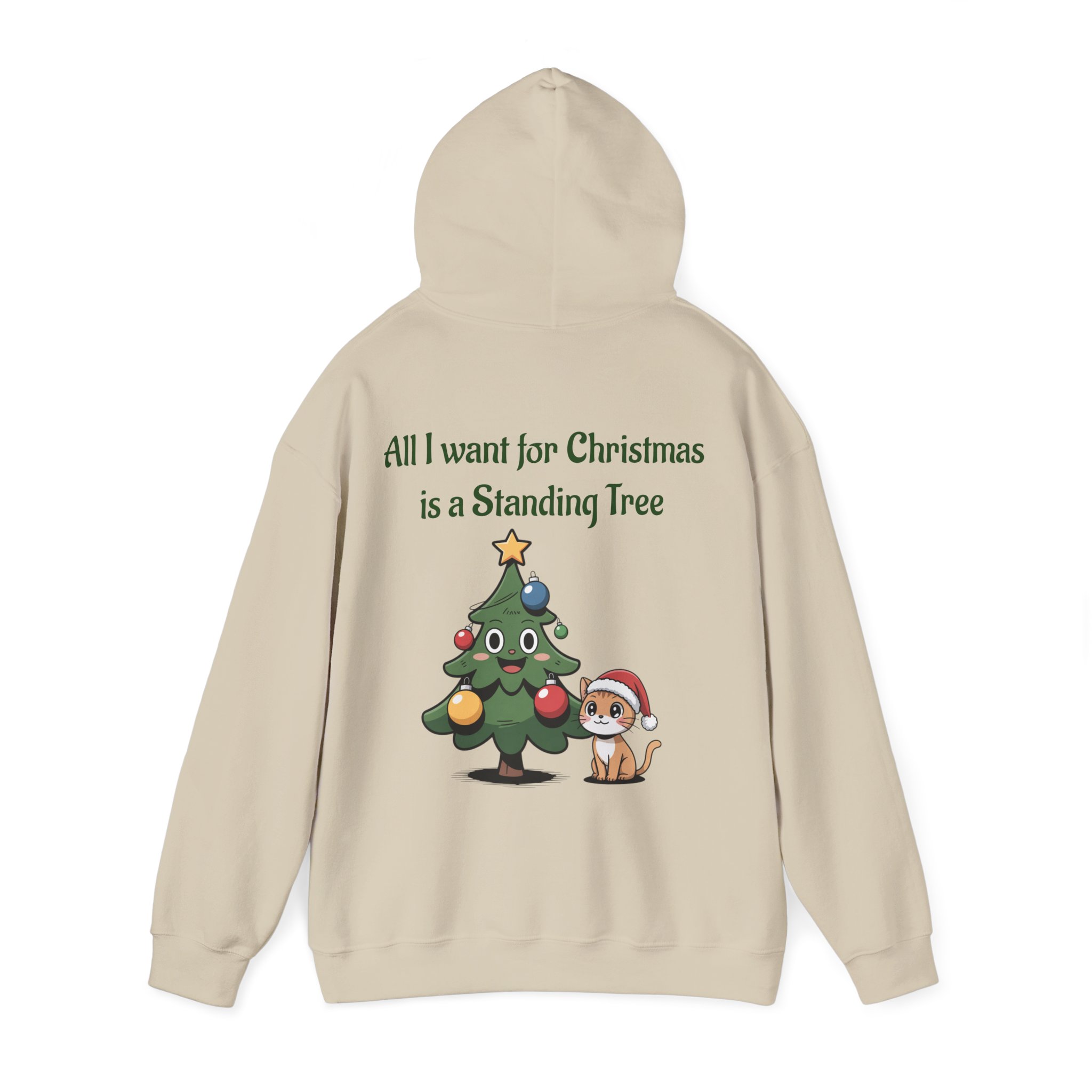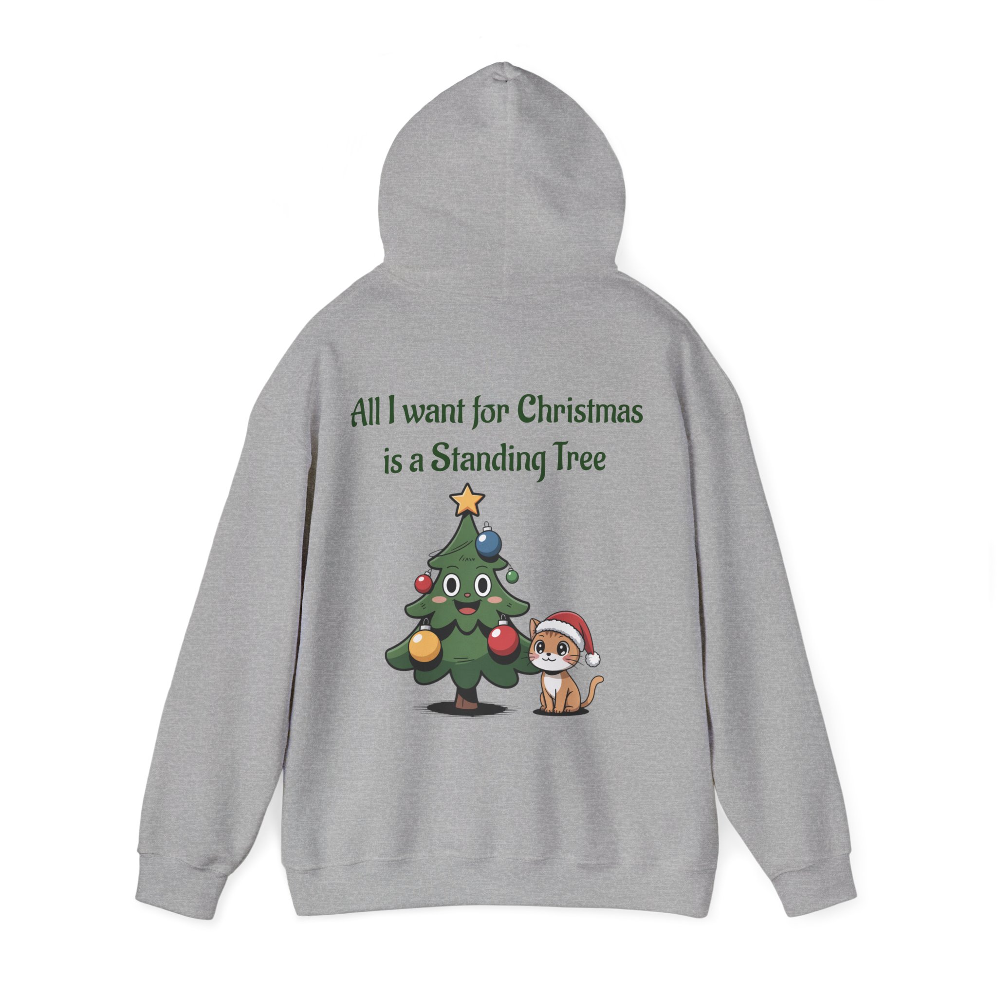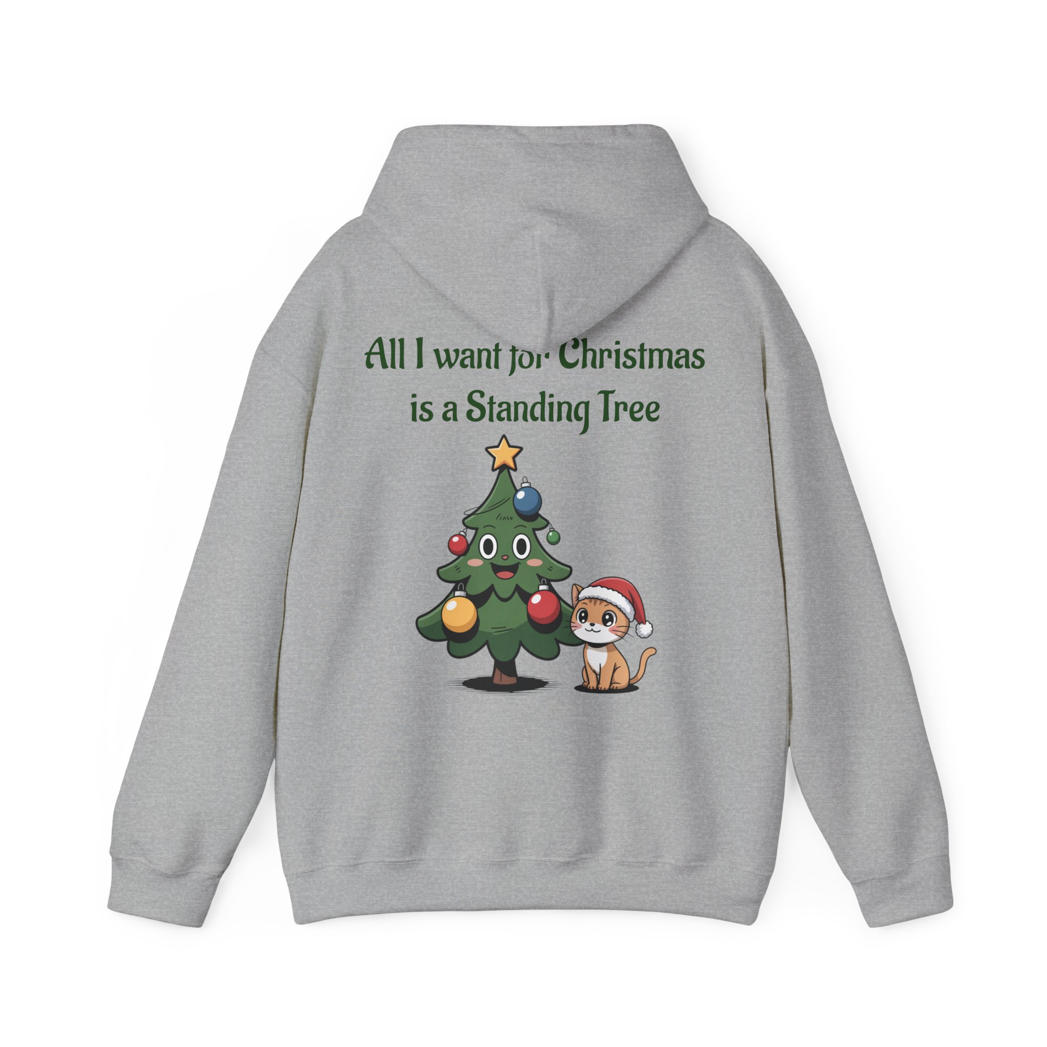 Wrap yourself in cozy, playful cheer with this soft, medium-weight hoodie featuring a sweet holiday cat and tree design. The front allows you to add your cat's picture. The back displays a cheeky decorated tree and the line “All I want for Christmas is a Standing Tree,” bringing a wink of humor to festive gatherings. The roomy kangaroo pocket and double-lined hood keep hands warm and add structure, while the smooth cotton/poly blend holds prints and embroidery crisply. Wear it at tree-lighting nights, casual holiday get-togethers, or quiet evenings by twinkling lights — it settles like a warm hug and sparks smiles whenever you move. And maybe, just maybe, your cat will grant you your wish 😉.