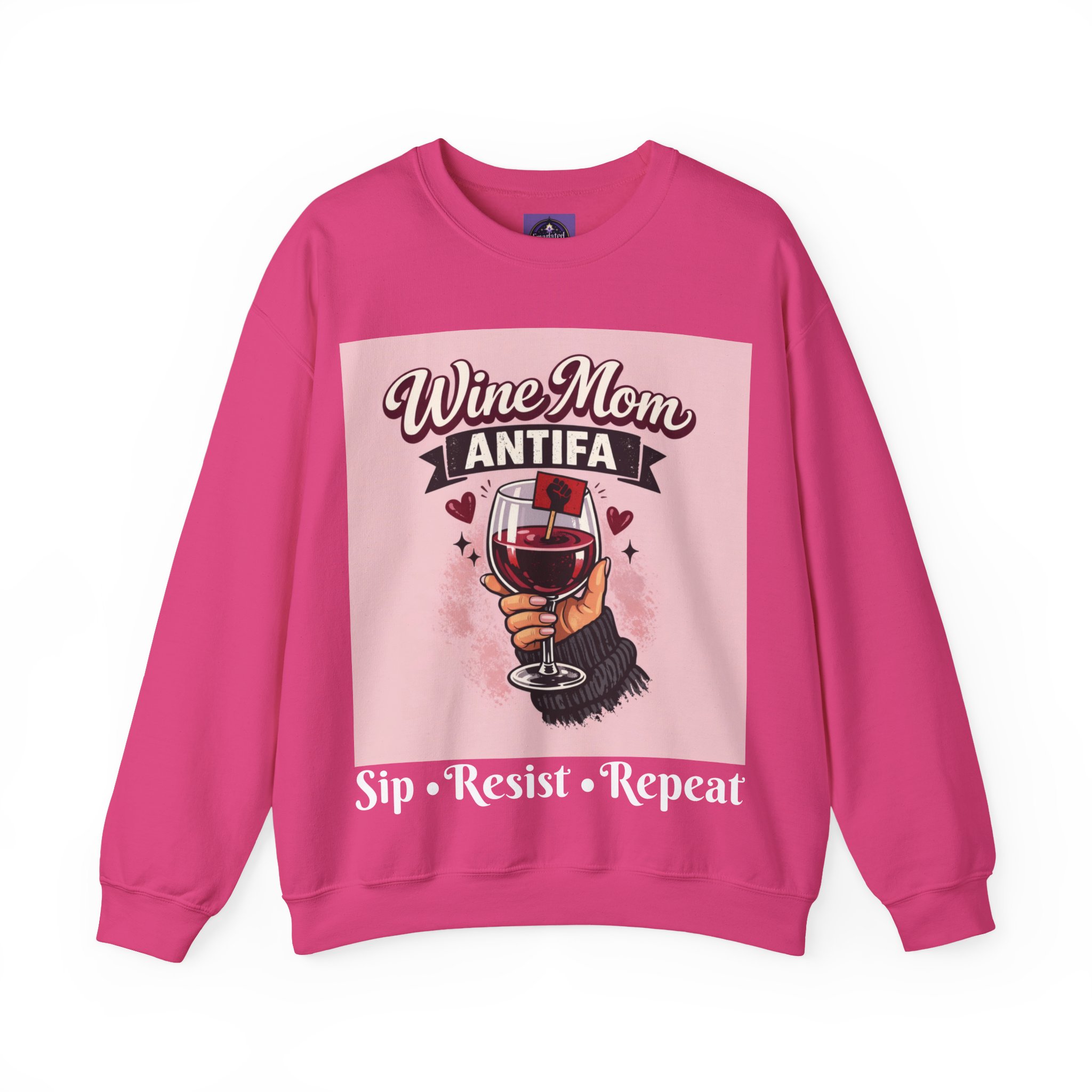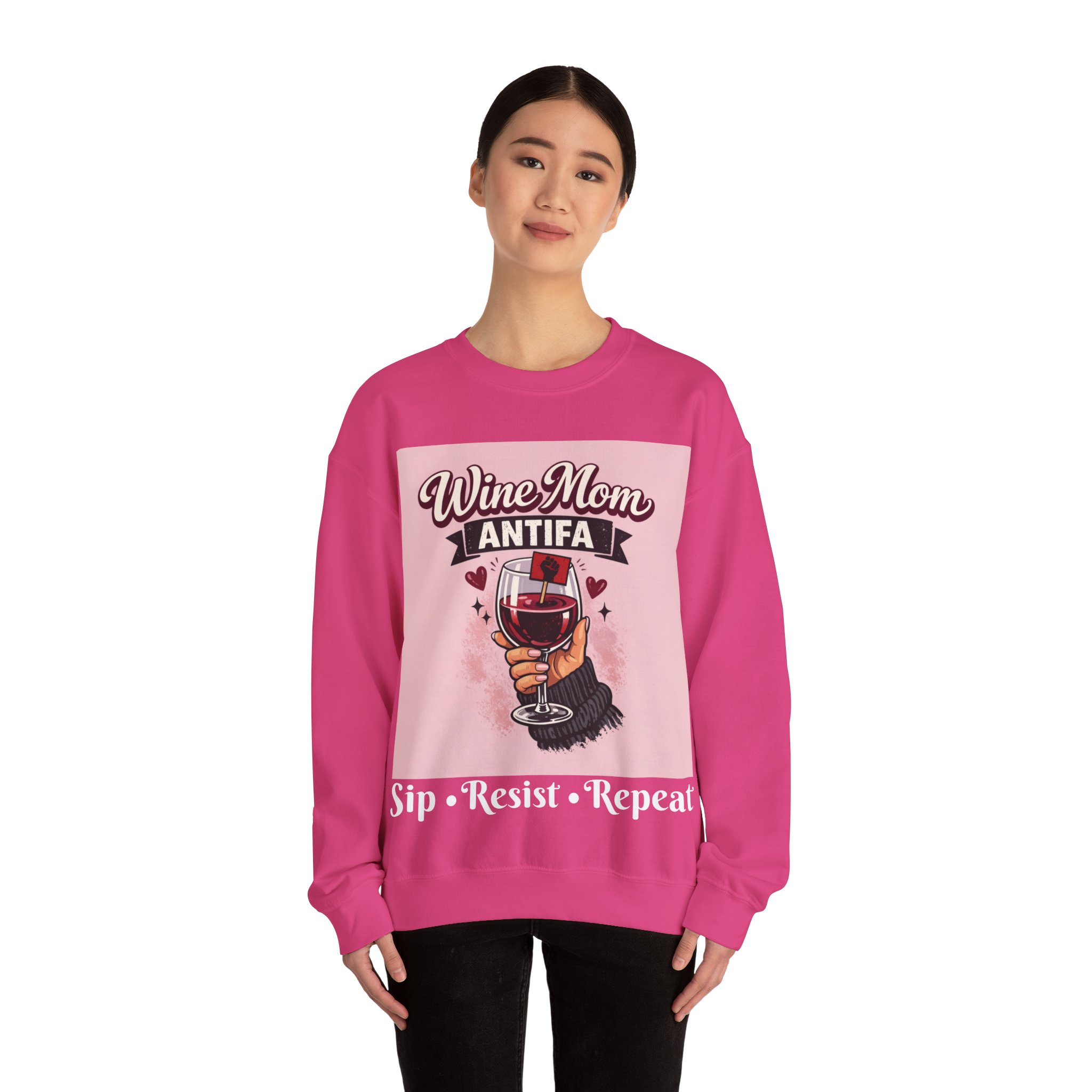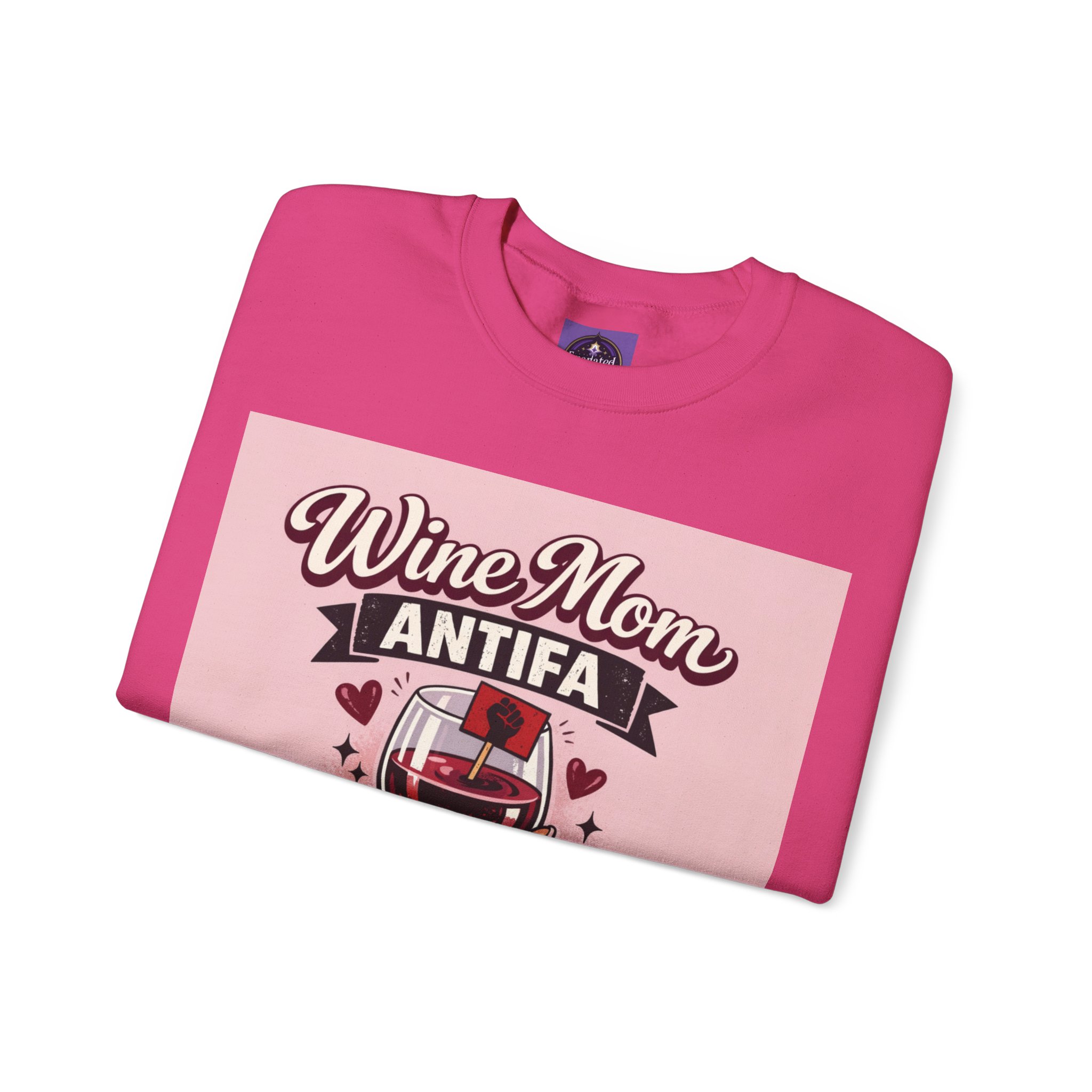 This cozy crewneck wraps a bold, playful message in a soft, lived-in sweatshirt. A hand holding a wine glass sits beneath retro lettering and a small antifascist emblem — a cheeky, defiant combination that reads like a wink shared between friends. Wear it on slow evenings with a glass in hand, to neighborhood meetups, or layered on cool mornings while you run errands. The medium-heavy fleece feels warm without weighty bulk, the ribbed collar and cuffs keep shape after repeat wear, and the tear-away label keeps the neck itch-free. It looks at home at casual gatherings, community actions, or low-key nights in, giving comfort and a clear voice all at once.