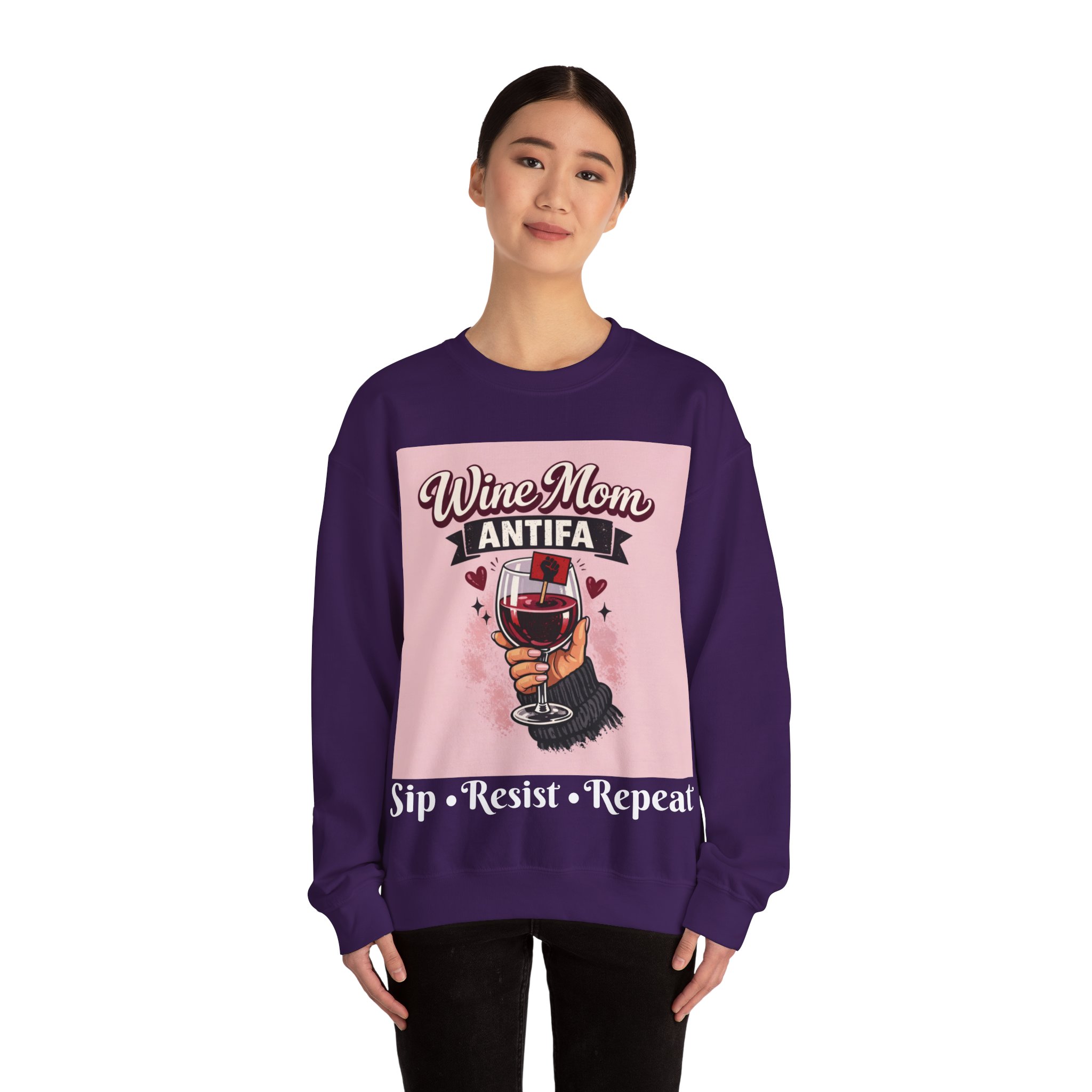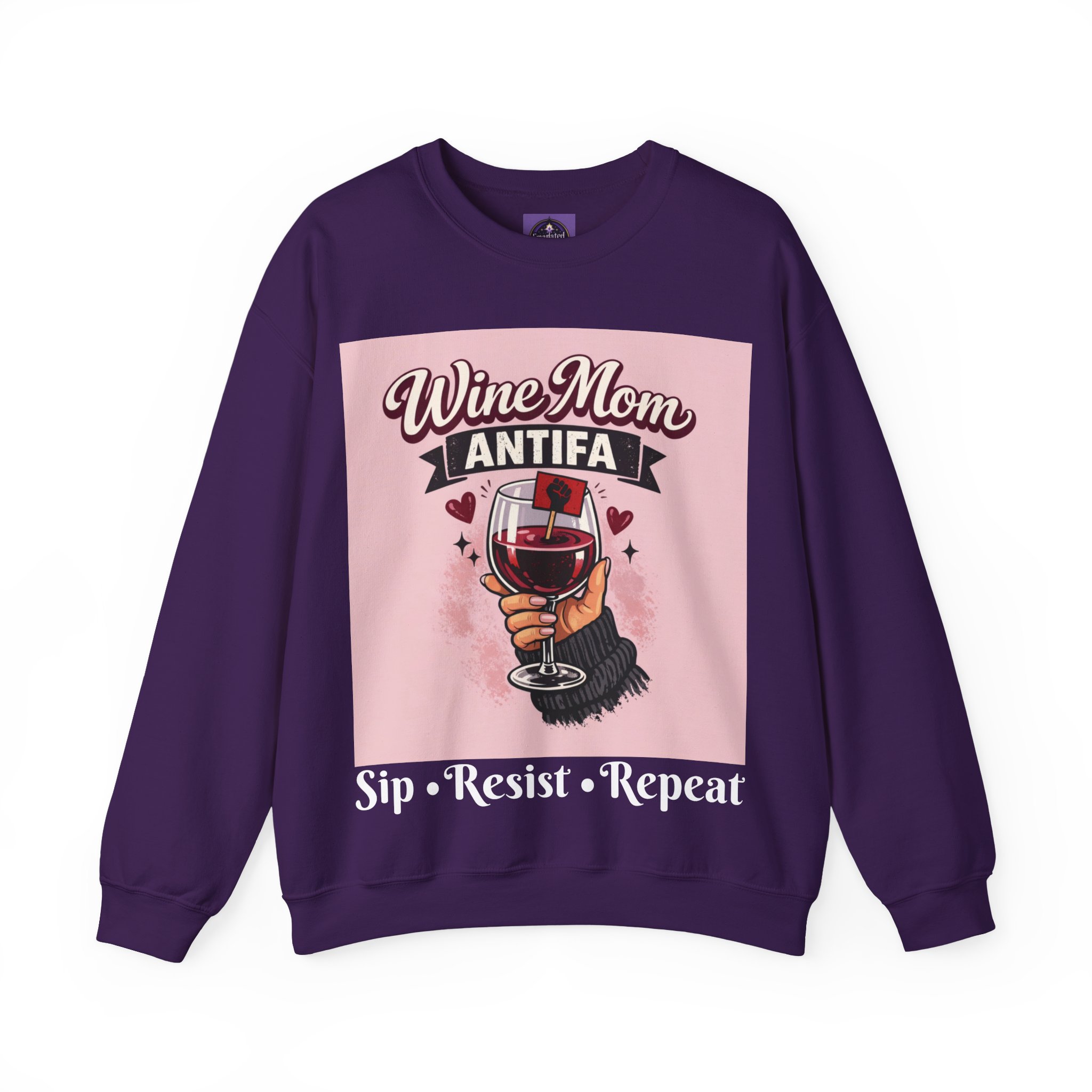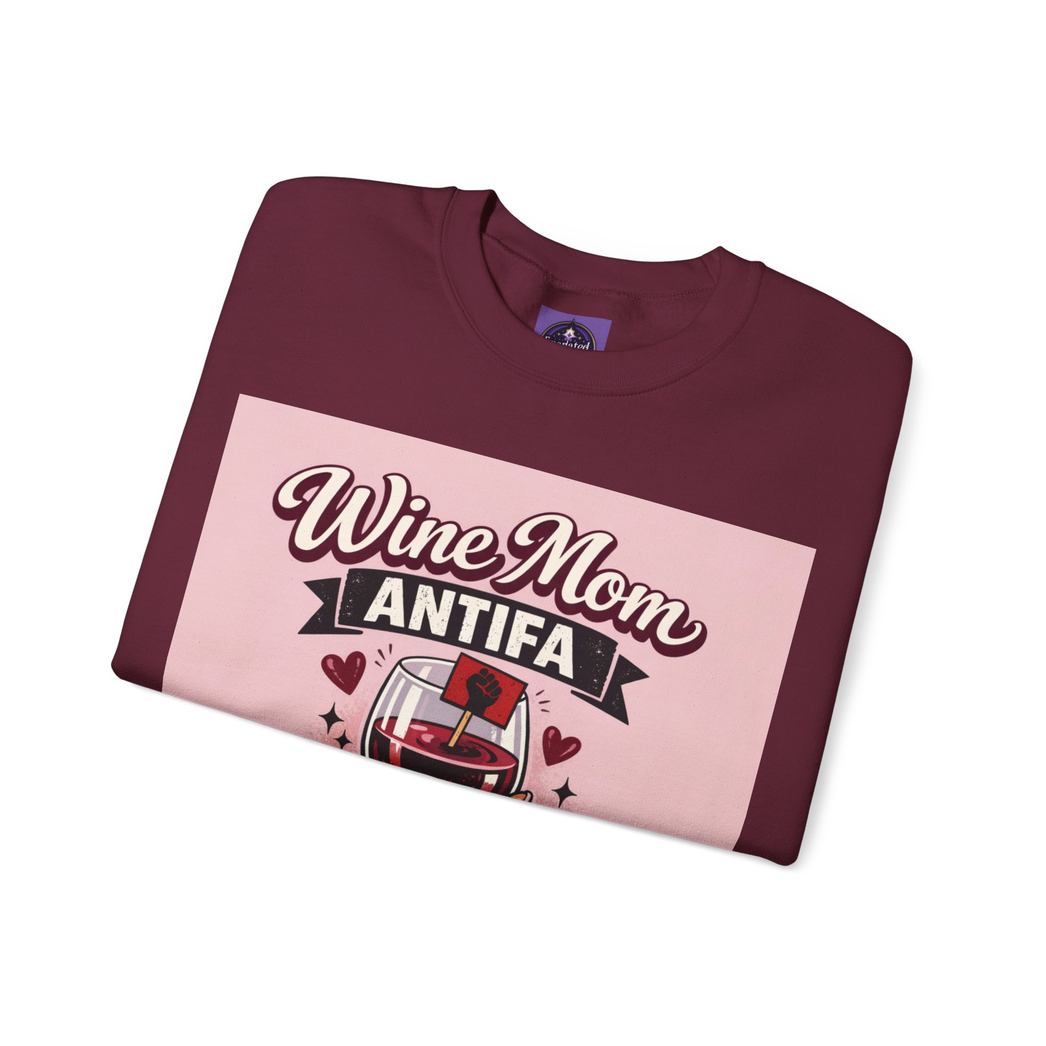 This cozy crewneck wraps a bold, playful message in a soft, lived-in sweatshirt. A hand holding a wine glass sits beneath retro lettering and a small antifascist emblem — a cheeky, defiant combination that reads like a wink shared between friends. Wear it on slow evenings with a glass in hand, to neighborhood meetups, or layered on cool mornings while you run errands. The medium-heavy fleece feels warm without weighty bulk, the ribbed collar and cuffs keep shape after repeat wear, and the tear-away label keeps the neck itch-free. It looks at home at casual gatherings, community actions, or low-key nights in, giving comfort and a clear voice all at once.