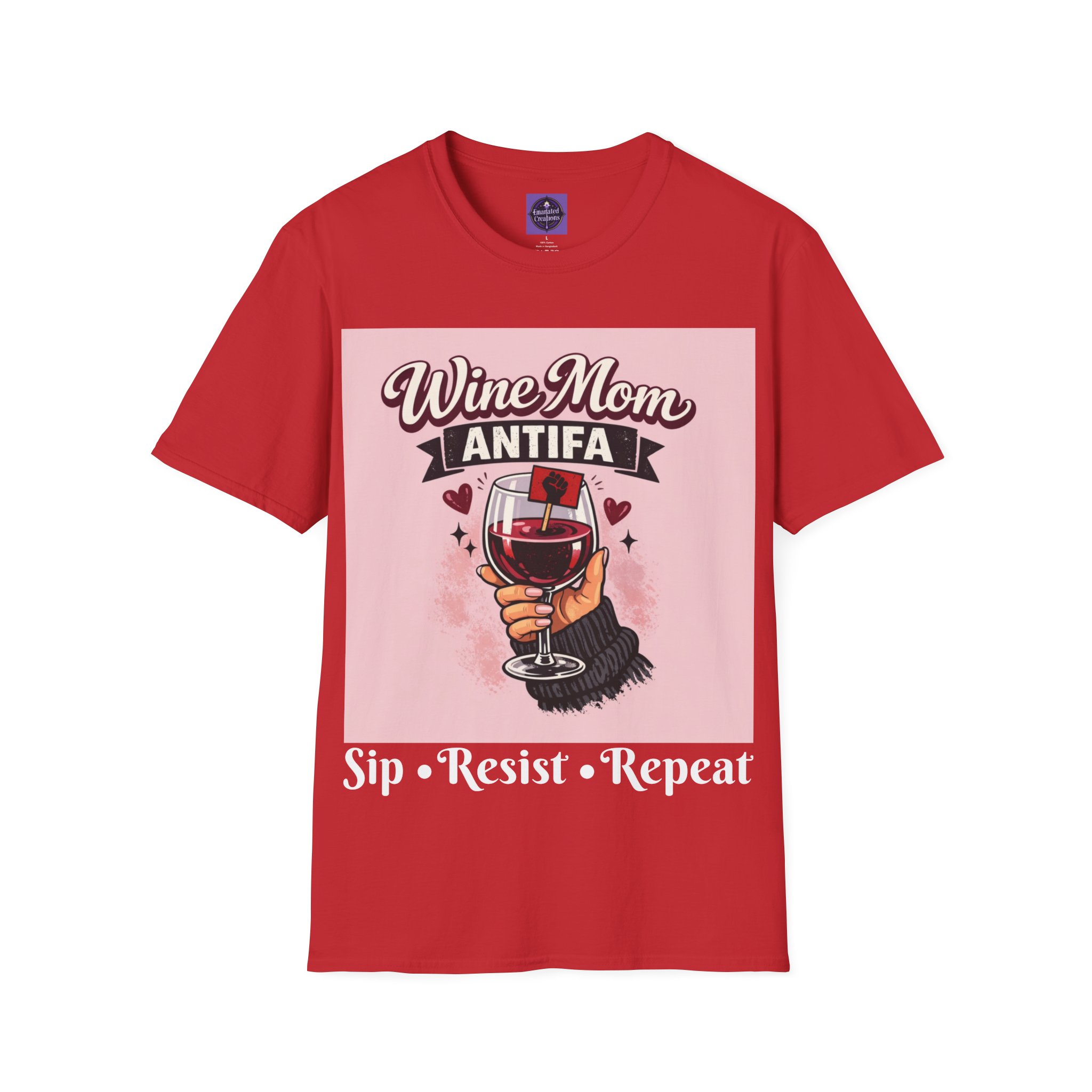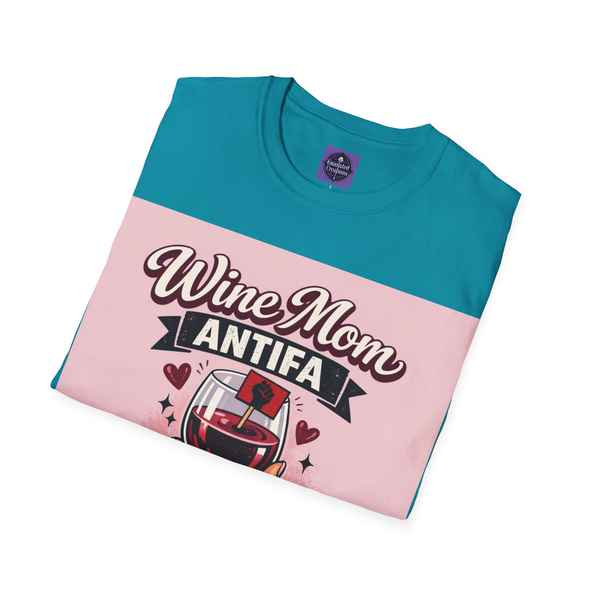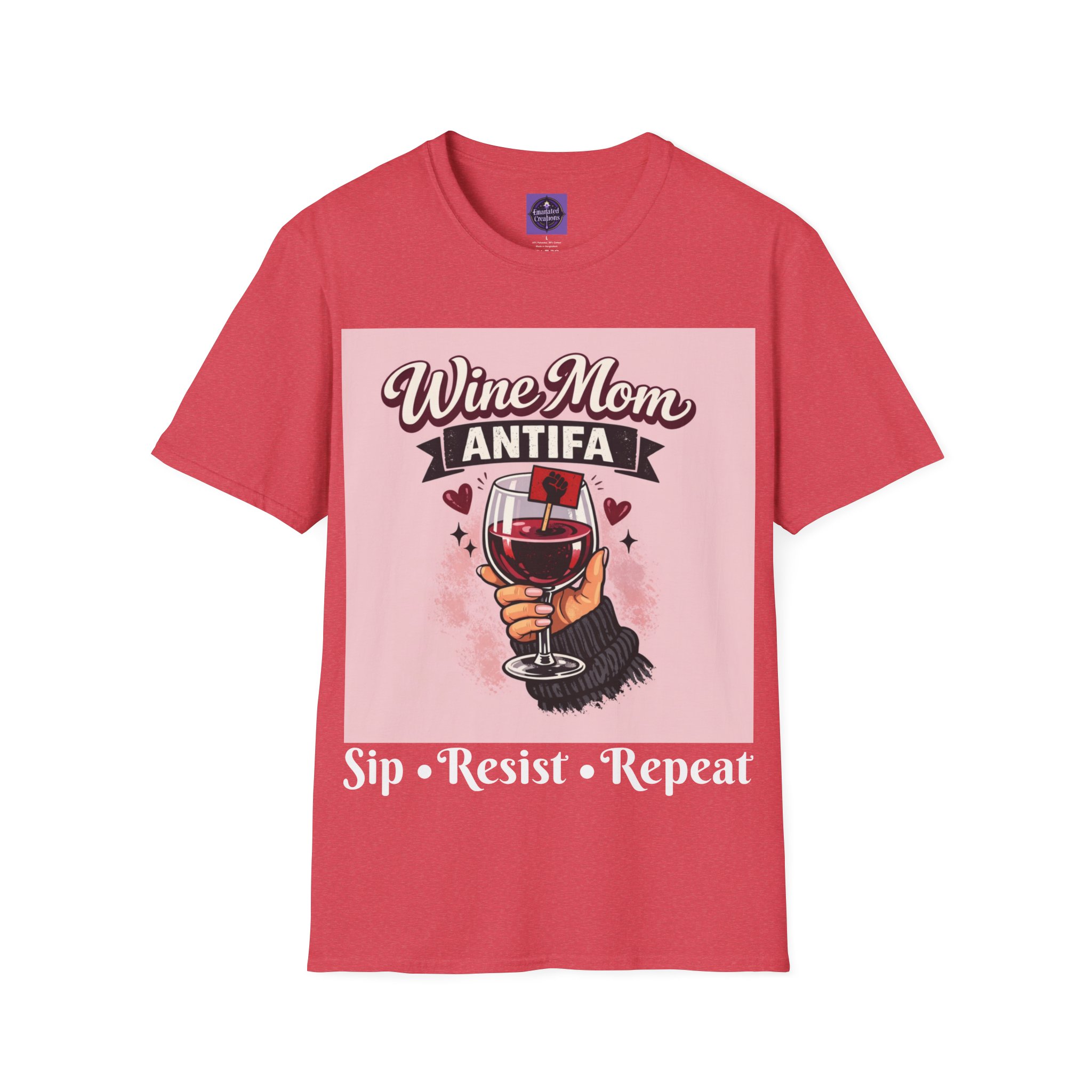 This cozy t-shirt wraps a bold, playful message in a soft, lived-in t-shirt. A hand holding a wine glass sits beneath retro lettering and a small antifascist emblem — a cheeky, defiant combination that reads like a wink shared between friends. Wear it on slow evenings with a glass in hand, to neighborhood meetups, or layered on cool mornings while you run errands. It looks at home at casual gatherings, community actions, or low-key nights in, giving comfort and a clear voice all at once.